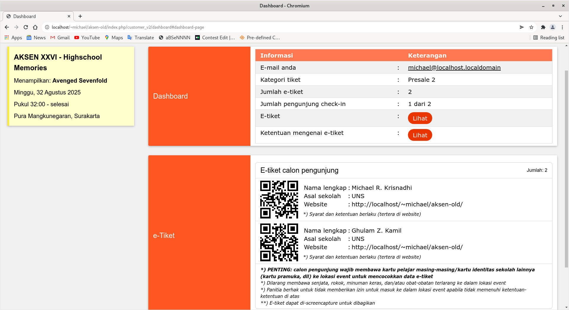 Proyek ini merupakan e-ticketing yang digunakan dalam acara Ajang Kreasi dan Seni (AKSEN) SMA Negeri 3 Surakarta pada tahun 2019 yang dibuka untuk umum. Pembayaran tiket dilakukan dengan metode transfer bank ditambah dengan nominal kode unik untuk mengidentifikasi transaksi yang masuk, serta verifikasi tiket menggunakan scan kode QR.