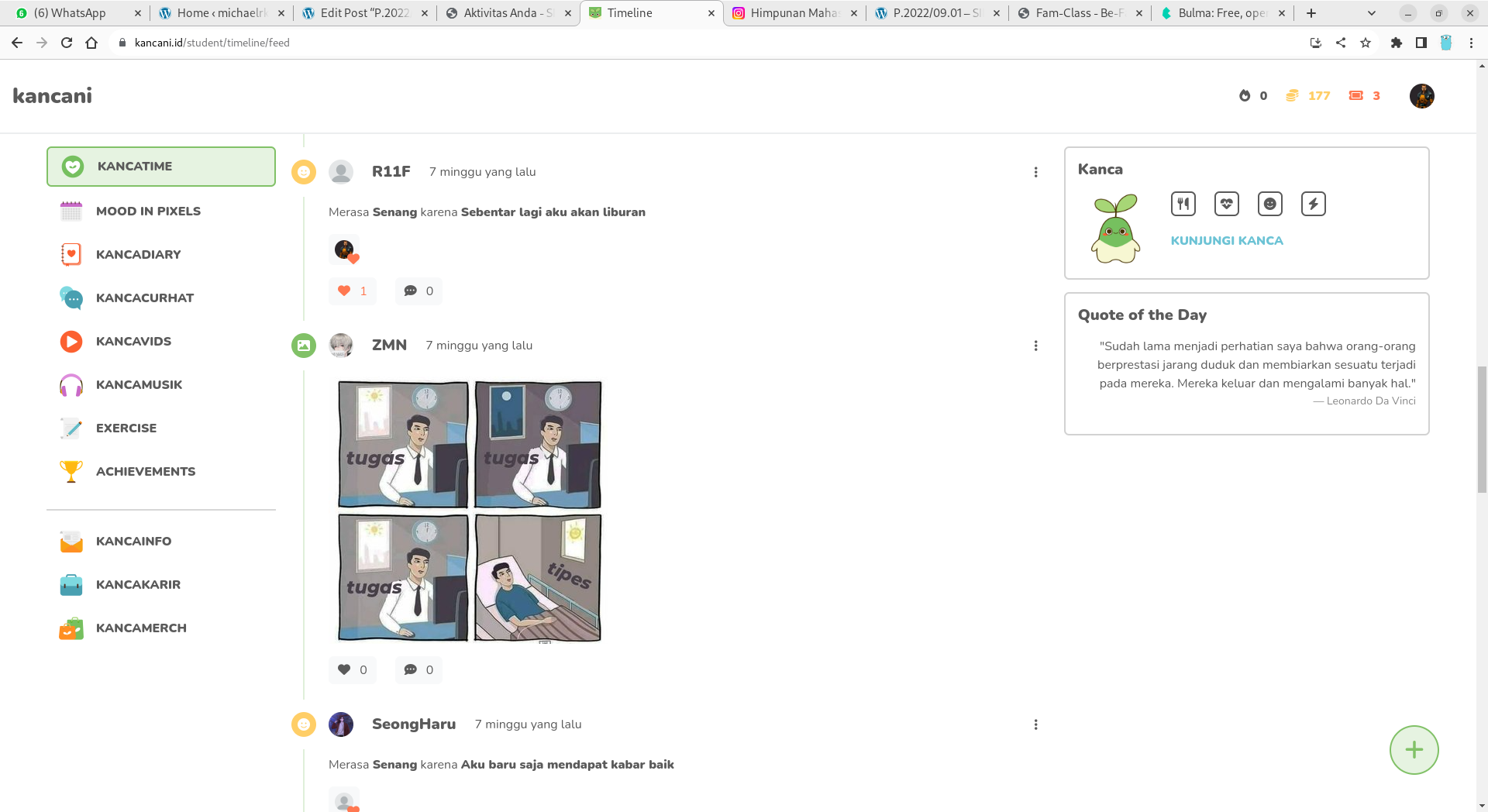 Fitur-fitur yang ada dalam aplikasi web ini cukup beragam, antara lain: (1) check-in emosi harian dengan intensitas (seperti termometer) beserta alasannya, (2) diary harian pengguna menggunakan mekanisme auto-save, (3) timeline yang memungkinkan pengguna membagikan aktivitasnya kepada pengguna lain dan saling berinteraksi, (4) rekap emosi tahunan yang disajikan dalam bentuk heatmap berwarna dua dimensi, (5) curhat anonim dengan sistem penjadwalan dan appointment, (6) virtual pet yang terinspirasi dari game Pou, memungkinkan siswa untuk merawat, memberi makan, dan kustomisasi hewan peliharaan virtual mereka, (7) daily challenge, quests, dan achievements untuk gamifikasi dan sistem reward kepada pengguna, (8) exercise yang berisi konten edukasi sosio-emosional yang disajikan dalam bentuk latihan interaktif, (9) quote of the day yang mengirimkan quote inspiratif kepada pengguna secara harian, (10) KancaVids yang berisi konten edukasi sosio-emosional yang disajikan dalam bentuk video, (11) KancaMusik yang mana merupakan music player berbasis web dengan memanfaatkan sinkronisasi playlist YouTube. Seluruh fitur tersebut berhasil diselesaikan dalam kurun waktu 3-4 bulan.