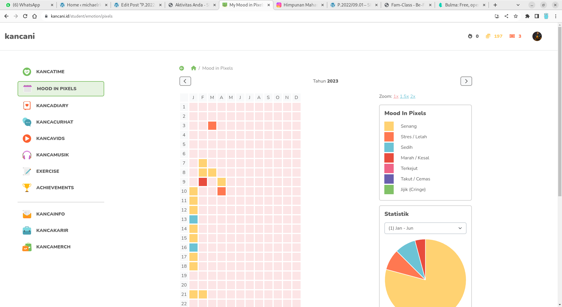 Proyek ini bermula dari 2 mahasiswa jurusan Psikologi dari proyek sebelumnya yang sudah selesai terlebih dahulu (Sibisa) mendatangi saya untuk bekerja sama lagi dalam proyek baru yang dimiliki Lazuardi Al-Falah GCS Klaten. Proyek tersebut merupakan aplikasi web sosio-emosional yang ditujukan kepada siswa (kala itu SMP) sekolah tersebut supaya lebih mampu mengekspresikan emosinya. Yang membuat proyek ini berkesan bagi saya adalah: (1) pertama kali menerapkan metodologi agile dalam mengerjakan proyek (yang mana rilis dilakukan secara iteratif), (2) memiliki set fitur yang banyak, kompleks, dan menarik, dan (3) mendorong saya keluar dari zona nyaman karena bereksperimen dengan teknologi baru seperti JavaScript Canvas, Google Cloud API, Push Notifications, dan Progressive Web Apps (PWA), serta mengasah kemampuan Frontend saya dengan desain yang dibuat menarik dan seramah mungkin terhadap pengguna.