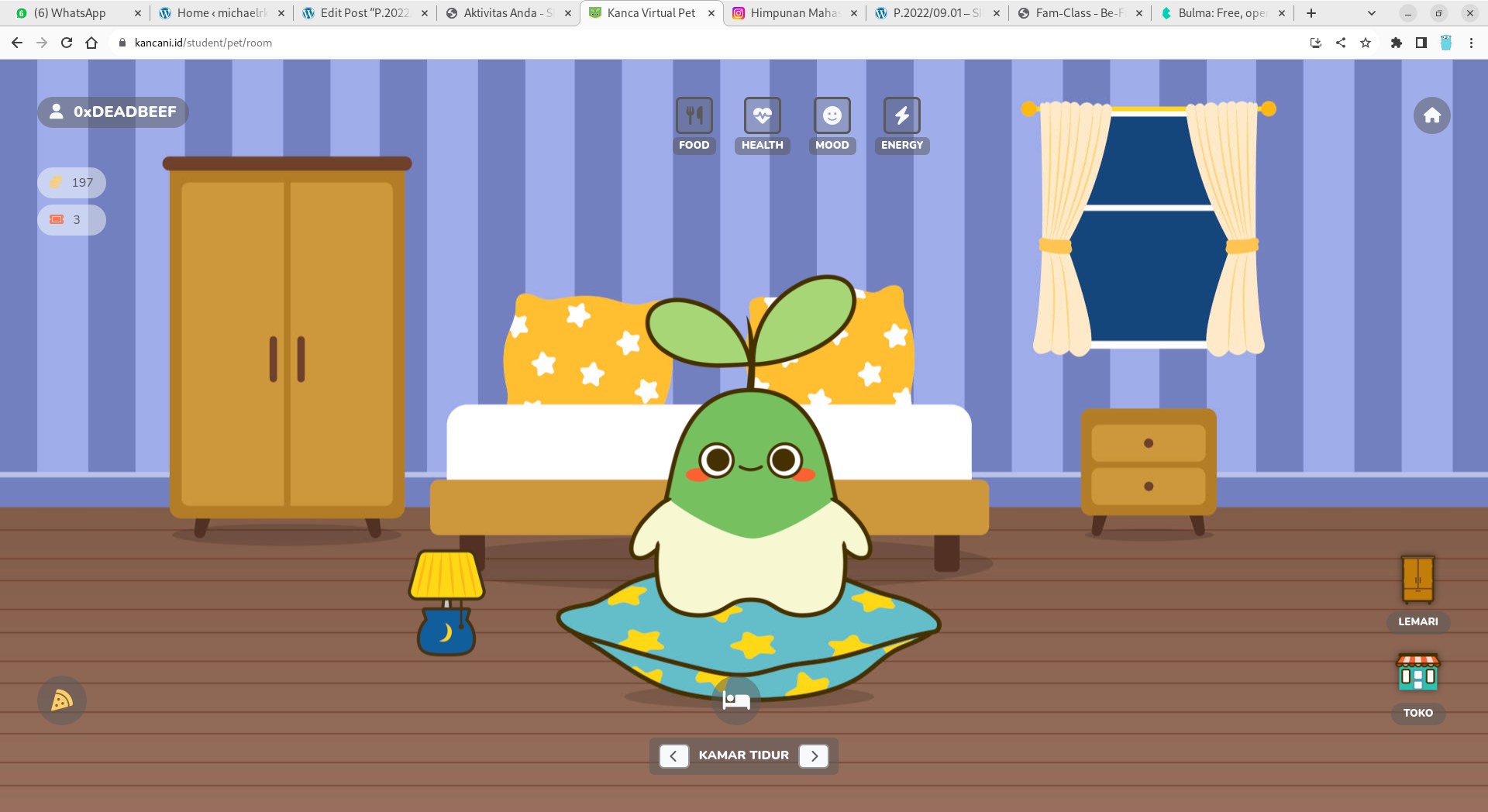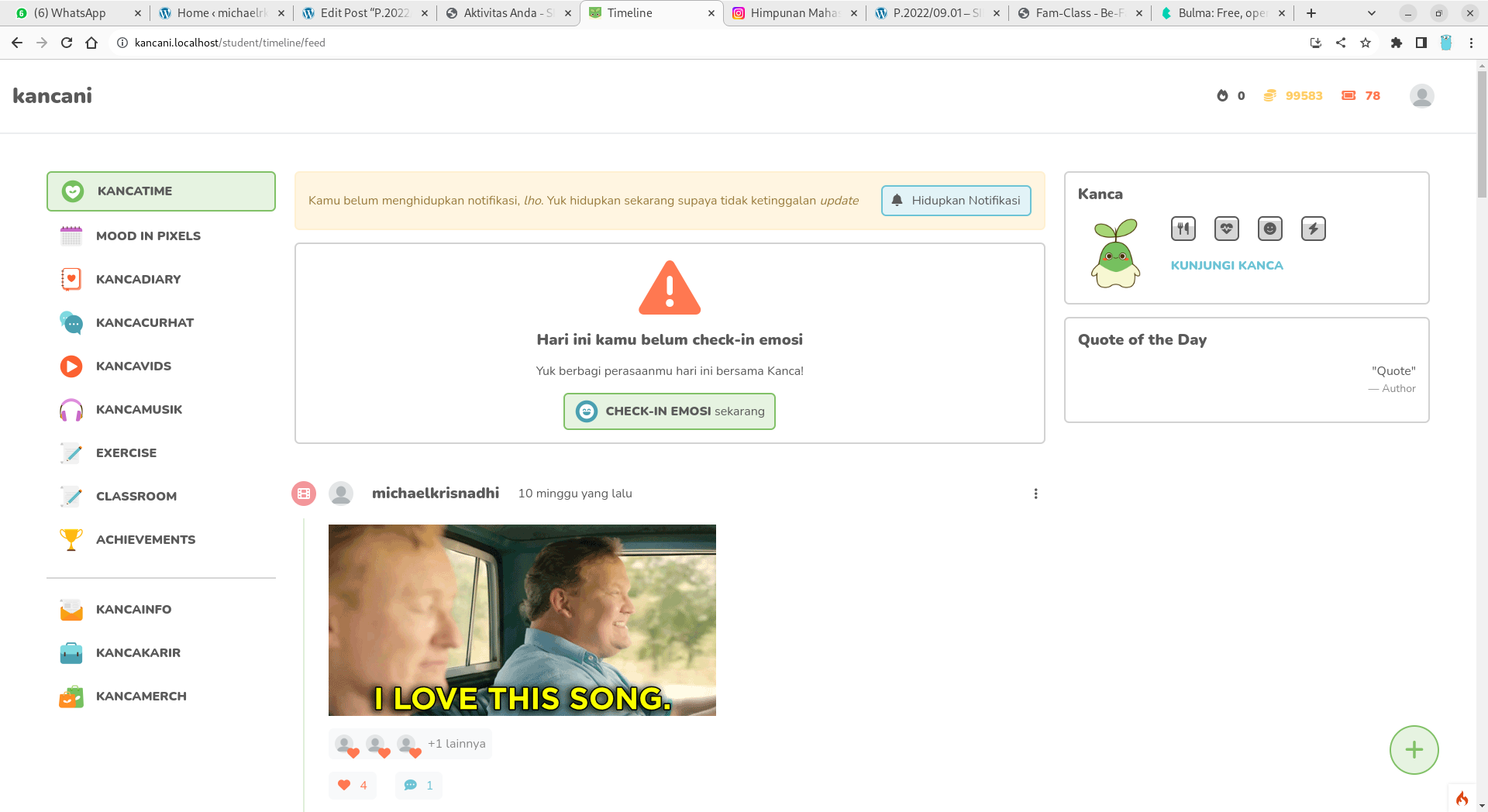 Dalam proyek ini saya juga bereksplorasi dengan teknologi yang sebelumnya tidak pernah saya gunakan. JavaScript Canvas berperan dalam pengembangan fitur virtual pet karena membutuhkan pengolahan grafik dalam browser yang cukup intens dan seamless. Kemudian Google Cloud API berperan dalam sinkronisasi playlist YouTube yang digunakan oleh fitur KancaMusik. Lalu Push Notifications digunakan dalam semua kebutuhan pengiriman notifikasi kepada pengguna, seperti quote of the day, pengingat check-in emosi dan mengisi diary harian, notifikasi curhat anonim, serta notifikasi virtual pet dalam keadaan seperti lapar, tidak enak badan, butuh teman, mengantuk, dan kotor. Untuk meningkatkan pengalaman pengguna ketika menggunakan HP, maka aplikasi web ini juga disajikan dalam bentuk Progressive Web App (PWA), serta desain UI yang ramah terhadap pengguna mobile.
